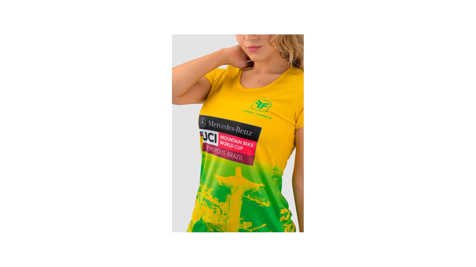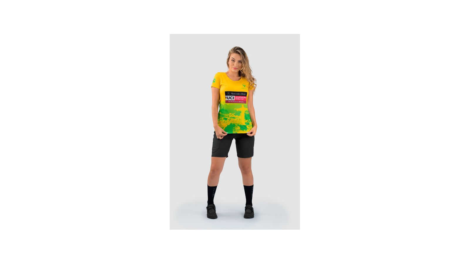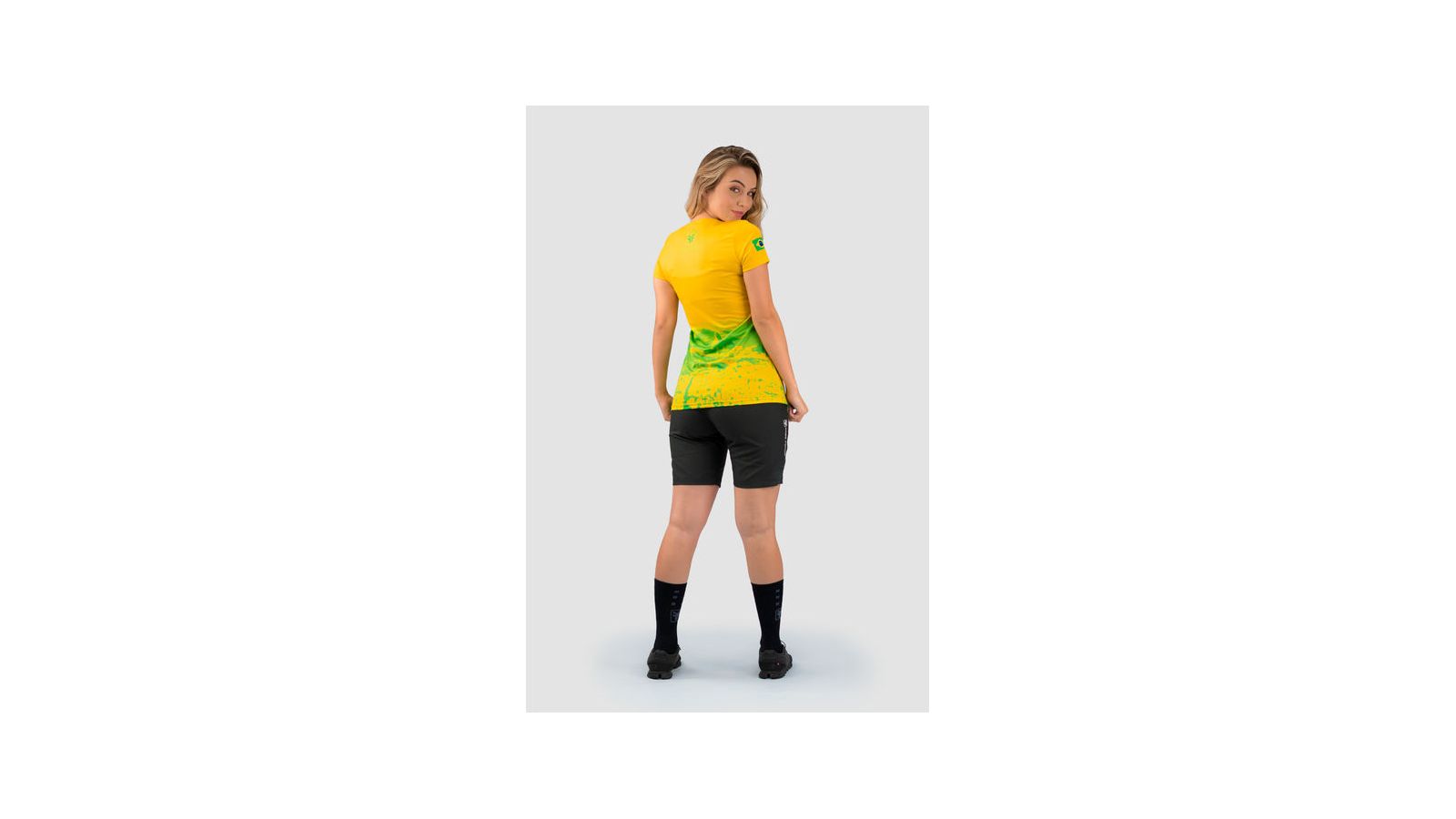 Feita em poliéster leve e respirável, a peça traz design nas cores verde e amarelo.
