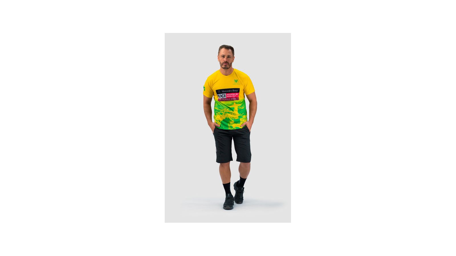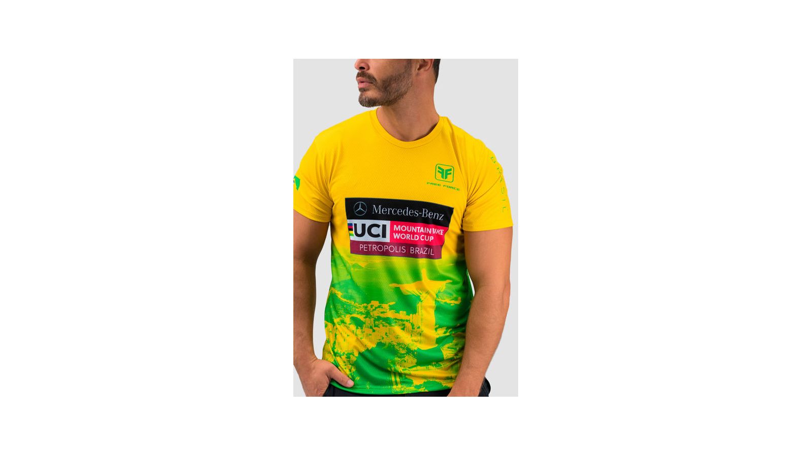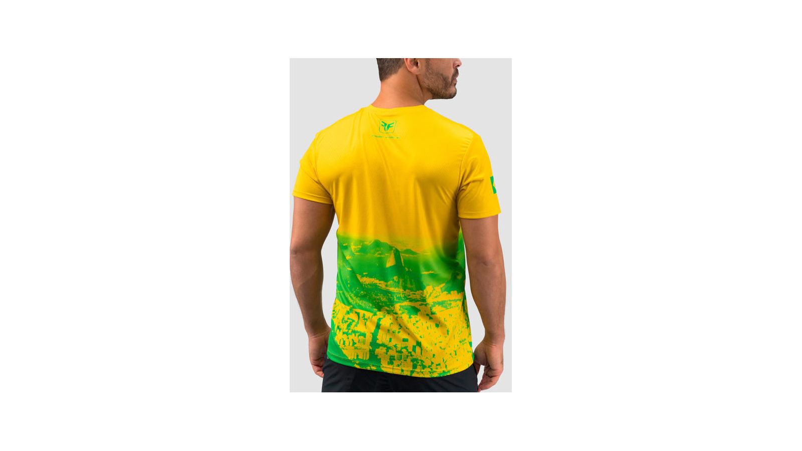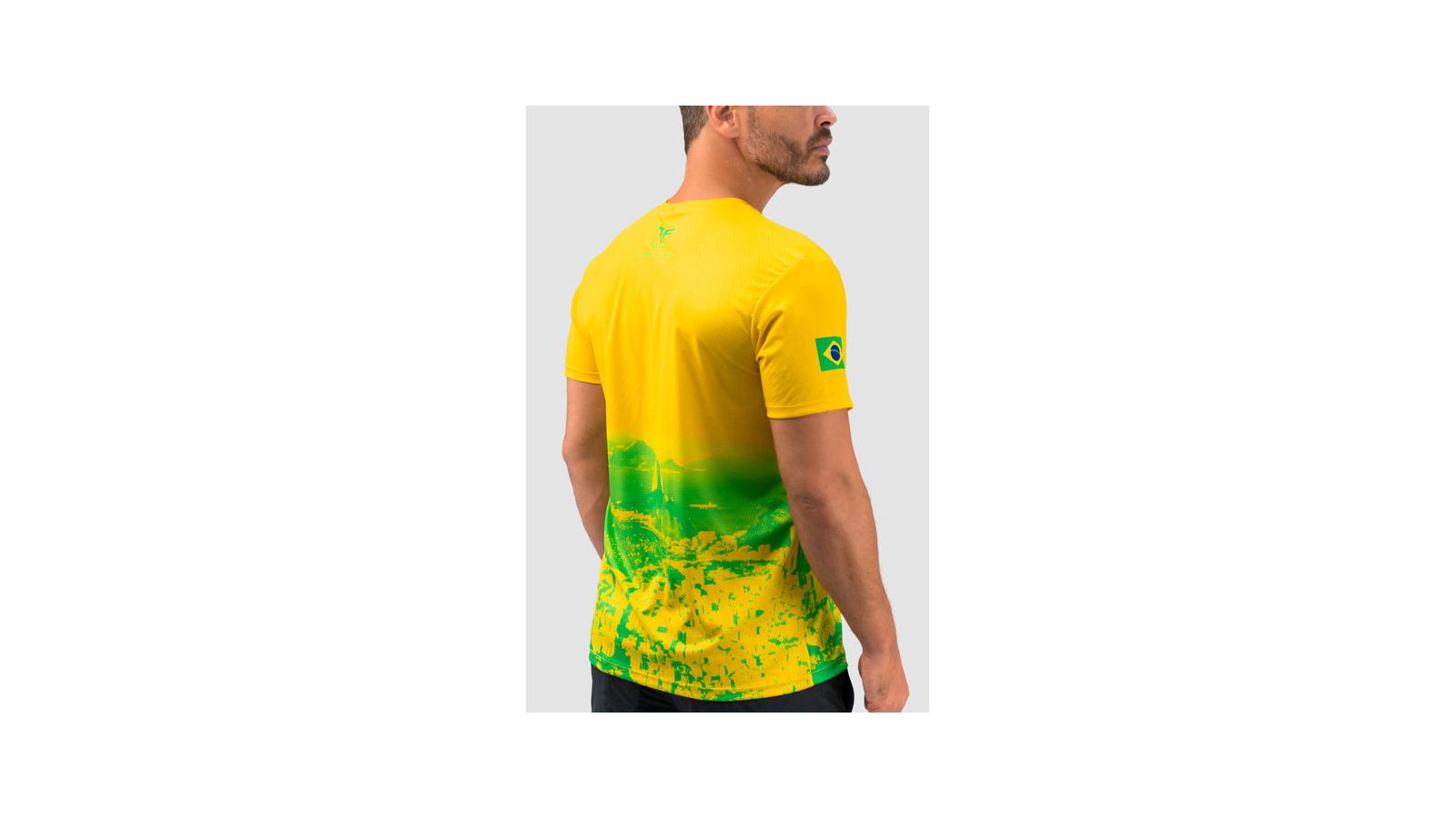 Feita em poliéster leve e respirável, a peça traz design nas cores verde e amarelo.