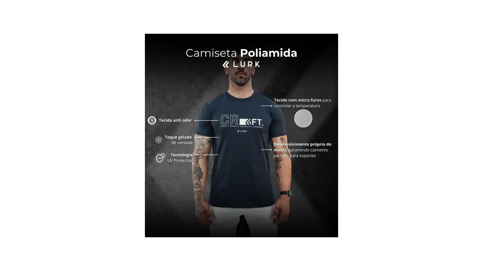 A Camiseta Poliamida UV Lurk possui uma trama em forma de furos, o que possibilita um maior desempenho na prática de esportes. Sua estrutura faz com que o calor do corpo passe por entre o tecido, deixando o corpo mais leve e seco. Este tecido contém a tecnologia UV Protection, que mantém a pele protegida contra os efeitos nocivos do Sol, bloqueando os raios UV. É perfeito para as práticas esportivas com exposição ao sol, como corrida, beach tennis, crossfit e musculação.
