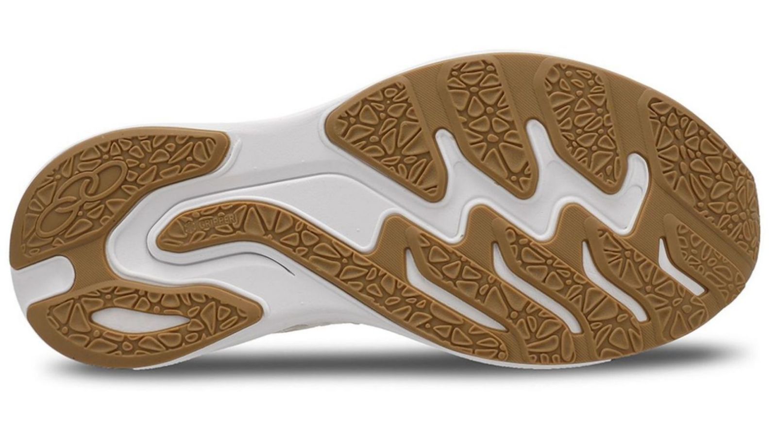 Borracha antiderrapante que garante contato firme com o chão. Seu desenho curvilíneo com pontos de contato distribuídos em seções favorecem a flexão e aderência.