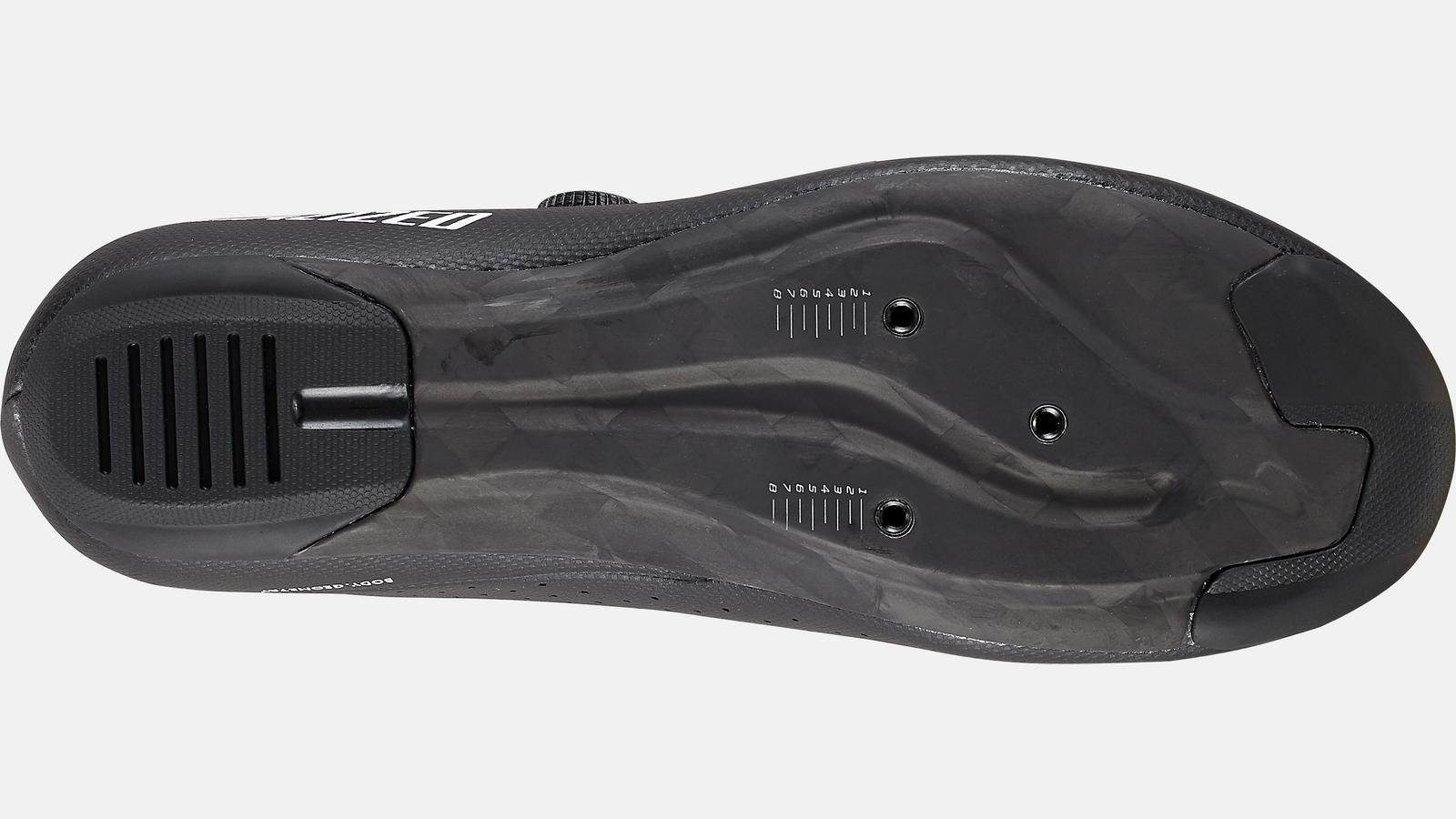 Woven Carbon sole engineered to be stiff, yet light with a large rubber heel and toe for off-the-bike traction.